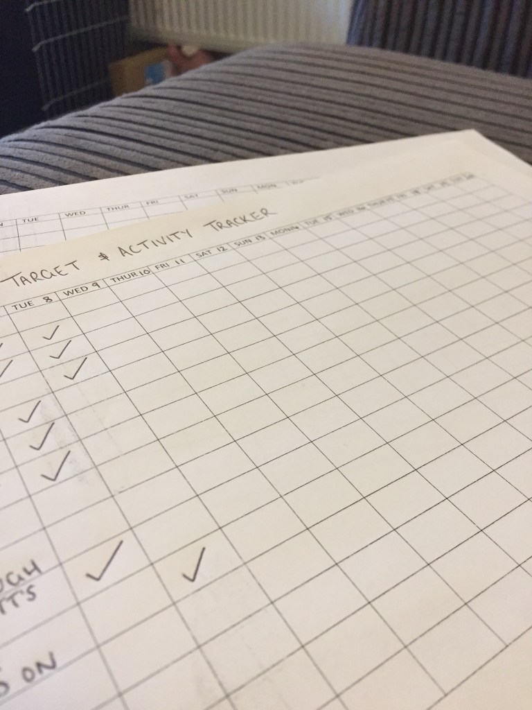 Activity Targets, for me, are simple things like “Brush my teeth”, “Wash my face”, “Shower”, “Wash my hair”… Putting a tick in those boxes does not happen every day but during times when my life feels completely overrun by suffering, getting to tick a box gives an incredible sense of achievement. My favourite tick to put in the box is “Make [Mr Tree Surgeon’s ] lunch” for work the next day. I haven’t managed for a while.