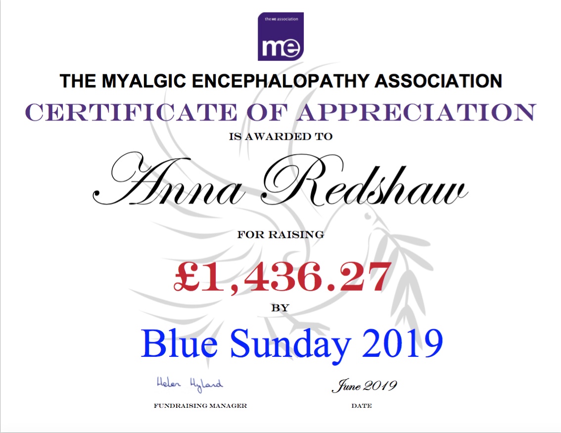 I’d like to thank everyone who joined in this year, whether it was their first time or whether they’re a Blue Sunday regular now. I’d like to mention Louise who once again held a family tea party and added the £132 that she raised to my own JustGiving page. I’d like to thank the anonymous donator of £200 – I still don’t know who you are! Thank you to those who donated some of their disability benefits or allowances. I understand how much of a chunk £5 is when you are living in a way that means every penny counts. And I’d like to thank my parents, who are the real heroes of this piece. Without them and their support and help, there would be no Blue Sunday.