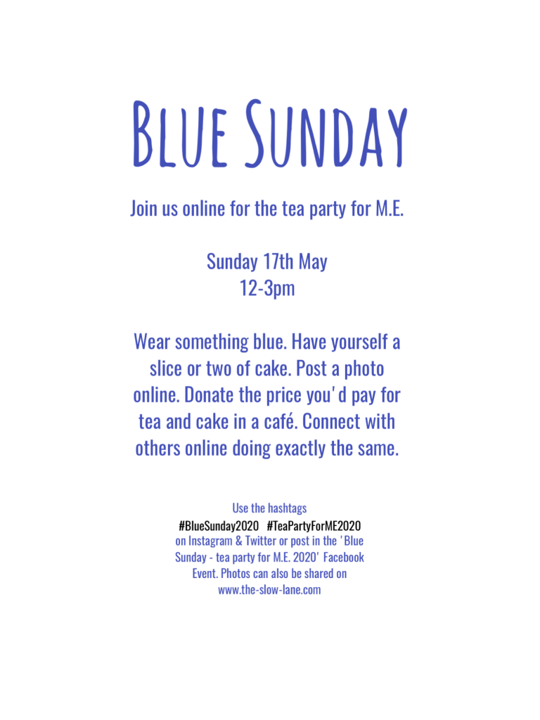 IMAGE DESCRIPTION: Blue writing on a white background reads “Blue Sunday. Join us online for the tea party for M.E. Sunday 17th May. 12-3pm. Wear something blue. Have yourself a slice or two of cake. Post a photo online. Donate the price you’d pay for tea and cake in a café. Connect with others online doing the same. Use the hashtags #BlueSunday2020 #TeaPartyForME2020 on Instagram and twitter or post in the ‘Blue Sunday – tea party for M.E. 2020’ Facebook Event. Photos can also be shared on http://www.the-slow-lane.com”