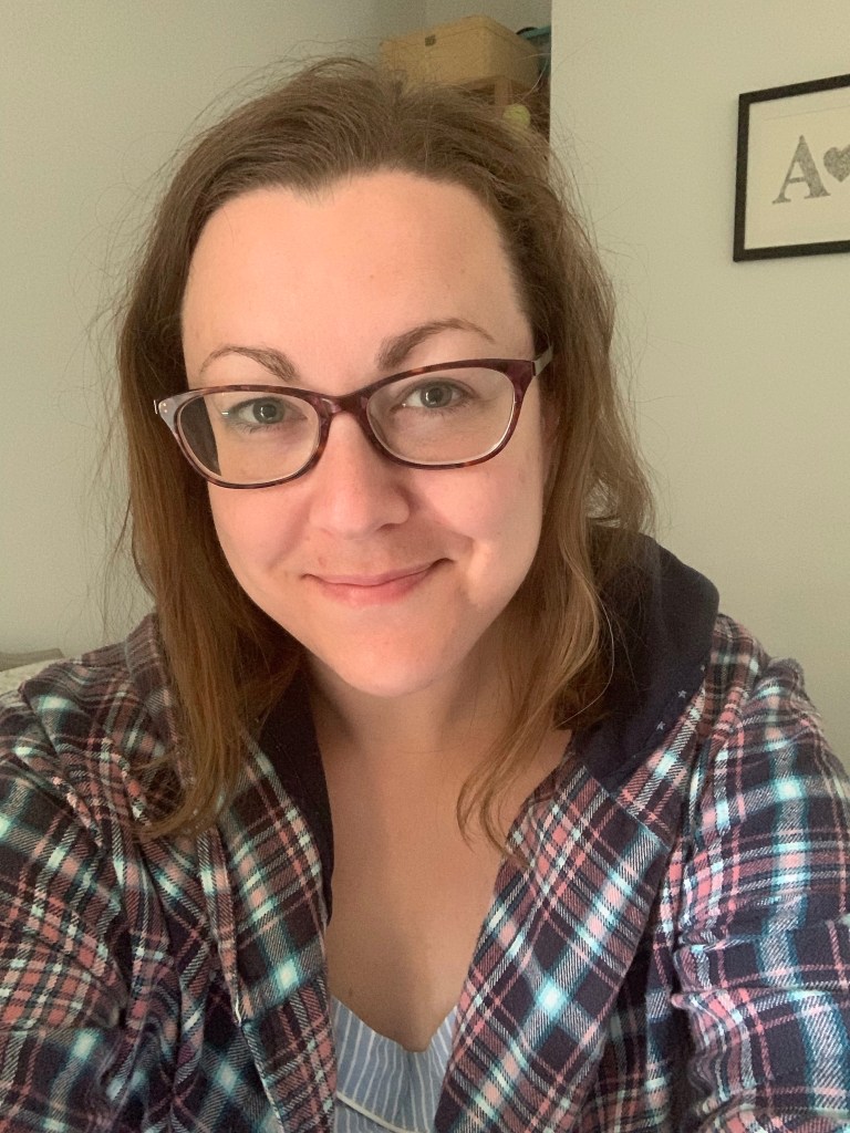 IMAGE: A selfie of Anna sitting on the edge of the bed in a tartan dressing gown. Her hair is falling out of a plait, and she hasn’t quite got the energy to smile properly but is quite happy.