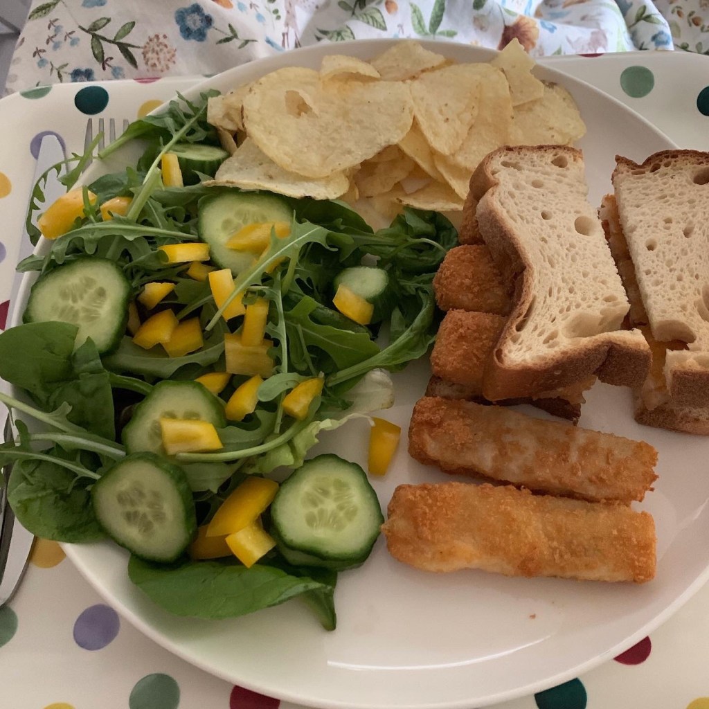 IMAGE: A plate of salad, crisps and a fish finger sandwich in the hilarious tiny gluten free bread that I have come to know and love. 10/10 adorable points for Mr Tree Surgeon today