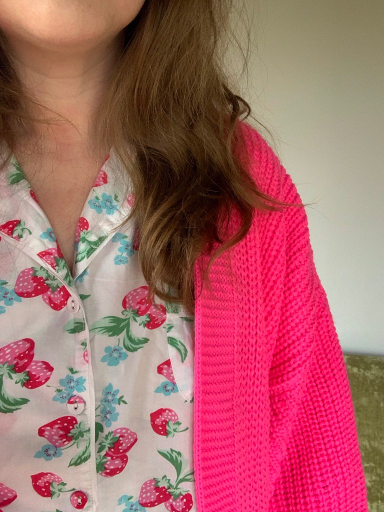 IMAGE: Anna’s upper body in strawberry print pyjamas and a cardigan that is much brighter than she thought it’d be when she ordered it online!