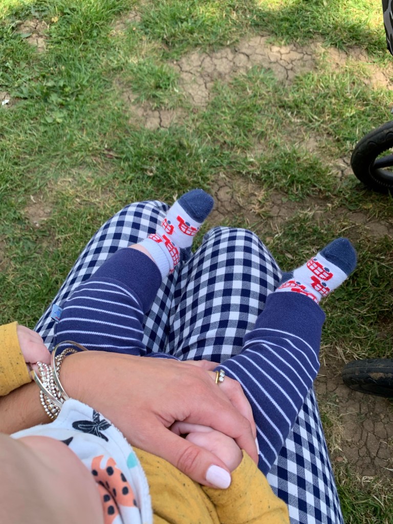 IMAGES: 1. Anna, a white woman with brown hair and glasses, on her orange mobility scooter. A child is riding it with her. Their face is blurred. 2. A child looking across some stepping stones. 3. A baby on Anna’s lap.