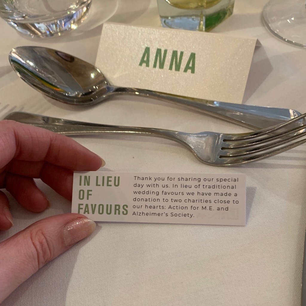 IMAGES: 1. A small cream card that says “in lieu of favours – thank you for sharing our special day with us. In lieu of traditional wedding favours we have made a donation to two charities close to our hearts: @actionform.e and @alzheimerssoc . 2. Anna, a white woman with wavy brown hair, cosplaying as a fully functioning human in a green bridesmaid dress. 3. Anna in her bed as she begins the recovery process.