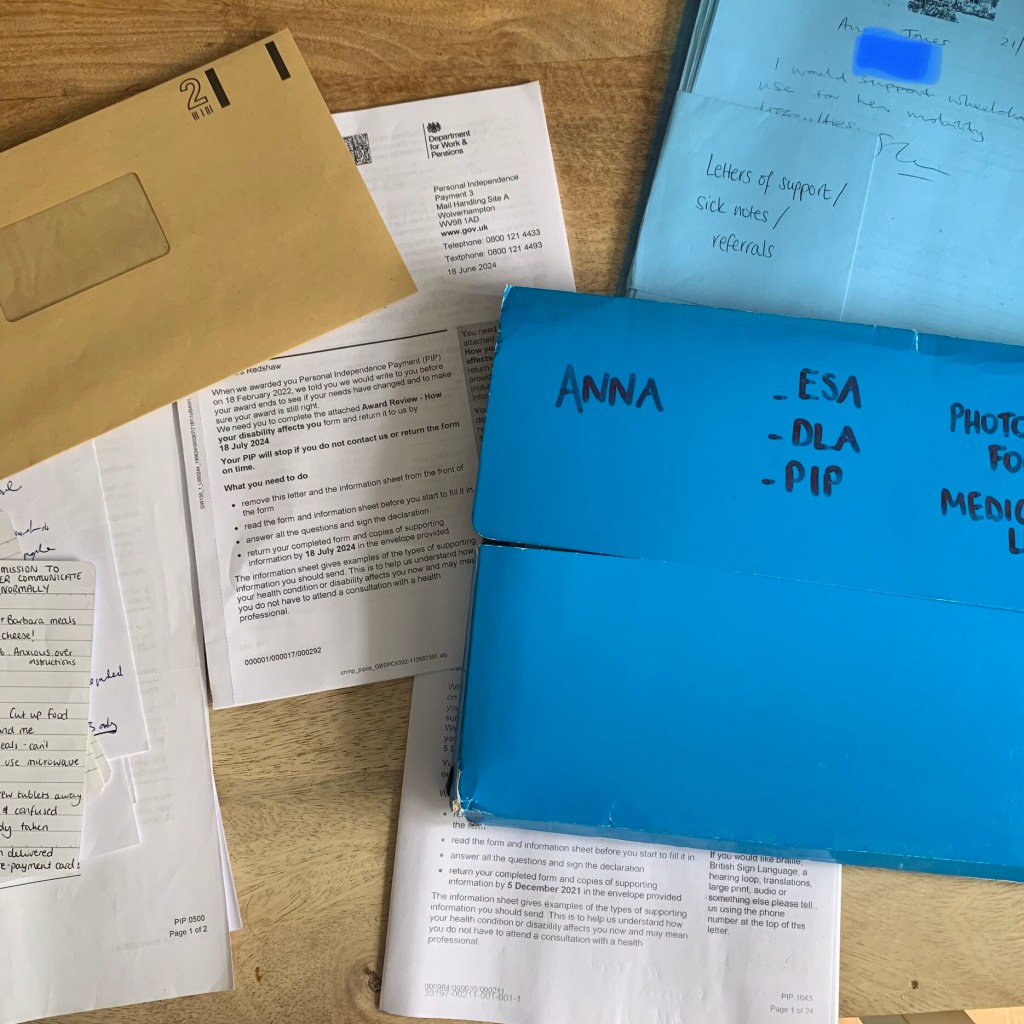 IMAGE: A table covered in paperwork as Anna and her mum begin the reassessment process for Personal Independence Payment (because the daft bat who assessed Anna 3 years ago imagined she’d be recovered by now)