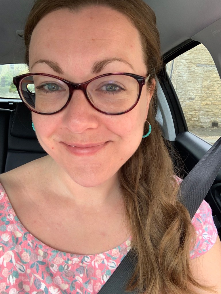 IMAGE: a selfie of Anna, a white woman with glasses and brown wavy hair, as she waits in the car for her chauffeur aka husband before her appointment