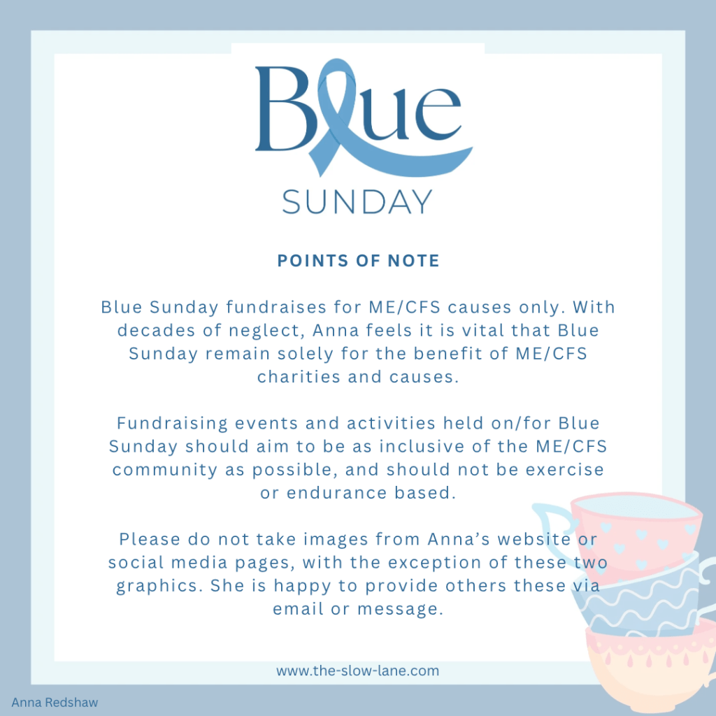 While there are a multitude of worthy causes and conditions that need donations, Blue Sunday will remain solely for the benefit of ME/CFS charities.